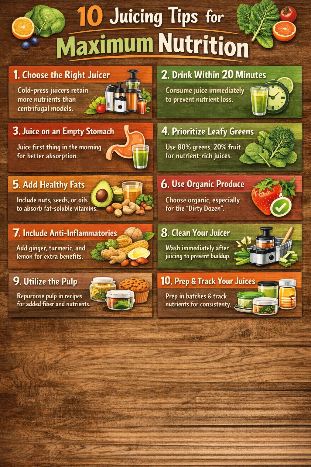 ตัวอย่างเช่น น้ำเขียวมาตรฐานซึ่งประกอบด้วยแตงกวา ผักโขม แอปเปิ้ลเขียว และมะนาว มีคุณค่าทางโภชนาการสูงแต่มีวิตามินเอค่อนข้างต่ำเมื่อเทียบกับน้ำส้มที่มีแครอทเข้มข้น บุคคลที่เน้นเรื่องสุขภาพดวงตาและภูมิคุ้มกันจะได้รับประโยชน์จากการสลับโปรไฟล์เหล่านี้ แทนที่จะทำซ้ำสูตรเดิมทุกวัน การติดตามแม้หนึ่งหรือสองสัปดาห์สามารถเปิดเผยรูปแบบและช่องว่างที่ไม่ชัดเจนจากการสังเกตแบบไม่เป็นทางการ