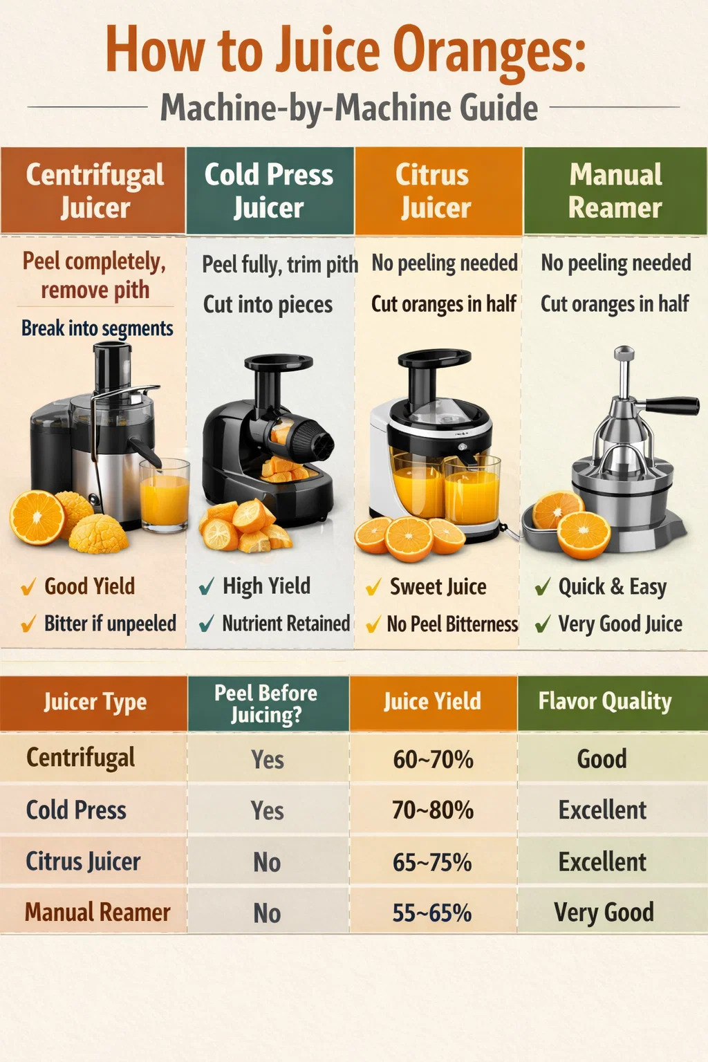 ตารางด้านล่างเปรียบเทียบเครื่องคั้นน้ำผลไม้หลักสี่ประเภทสำหรับการแปรรูปส้ม ซึ่งครอบคลุมข้อกำหนดในการเตรียม ผลผลิตน้ำผลไม้ คุณภาพรสชาติ และเวลาในการทำความสะอาดโดยทั่วไป