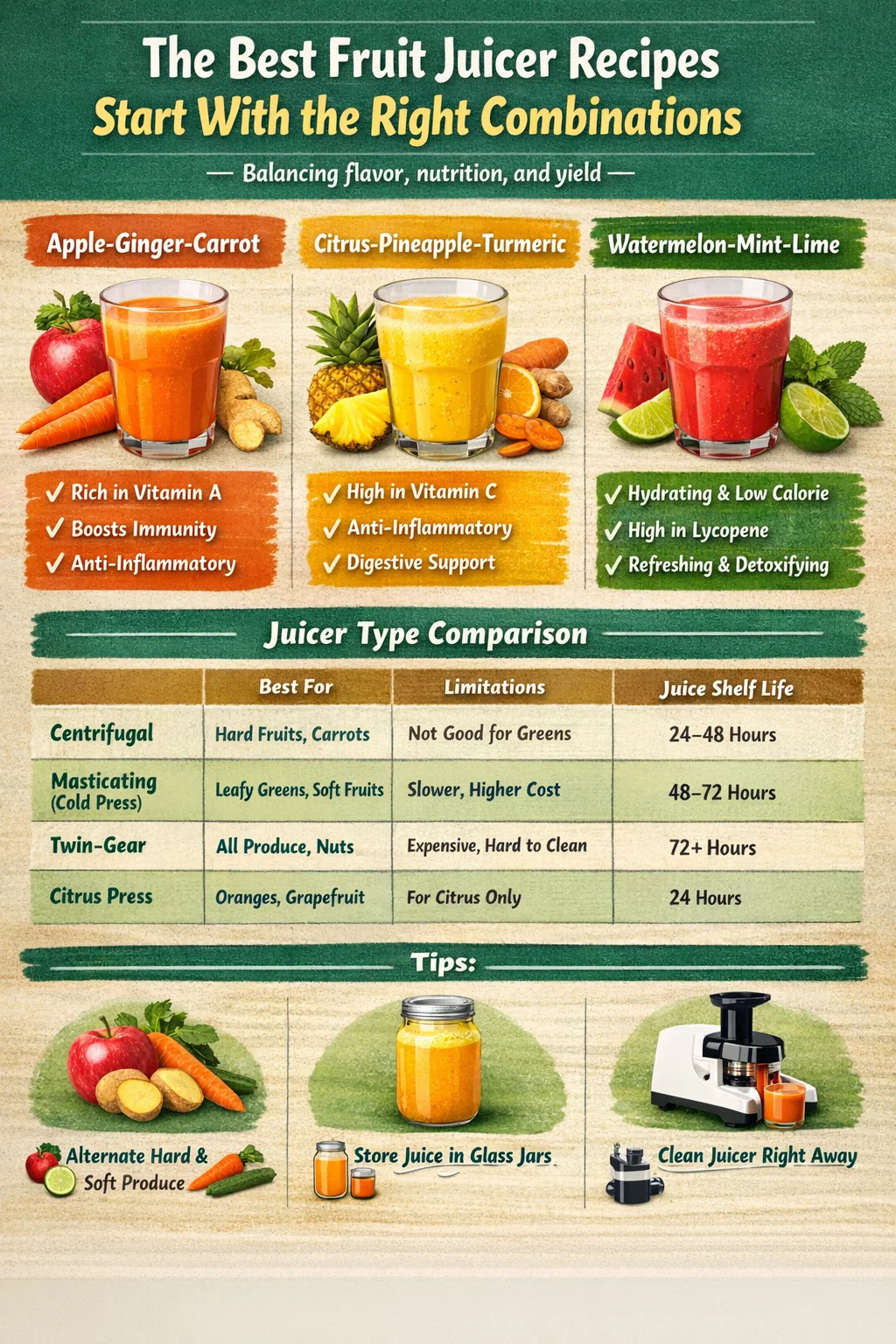 สูตรอาหารสามสูตรที่ผู้คั้นน้ำตามบ้านให้คะแนนสูงสุดอย่างต่อเนื่อง ได้แก่ แอปเปิ้ล ขิง แครอท ส้ม สับปะรด ขมิ้น และแตงโม มิ้นท์ มะนาว แต่ละสิ่งเหล่านี้ได้ผลเนื่องจากมีความสมดุลระหว่างความหวาน ความเป็นกรด และองค์ประกอบอะโรมาติกที่คมชัด นอกจากนี้ยังให้น้ำผลไม้ในปริมาณสูงต่อผลผลิตหนึ่งปอนด์ ซึ่งสำคัญเมื่อคุณป้อนผลไม้ลงในเครื่องคั้นน้ำผลไม้ทุกเช้า