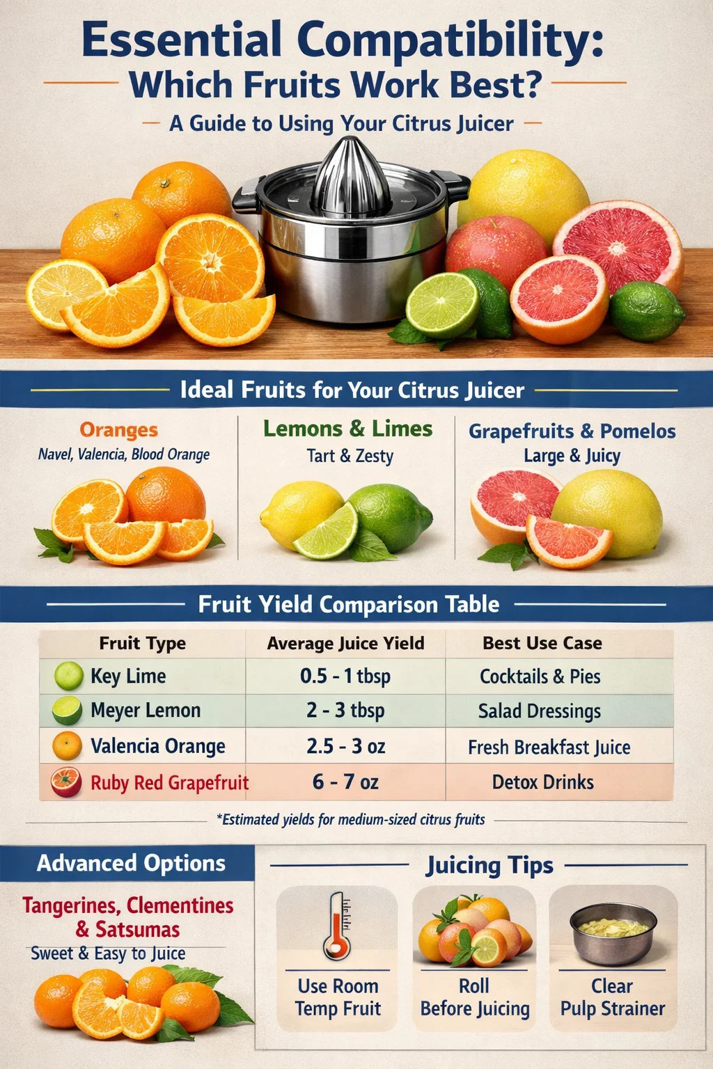 เพื่อช่วยคุณวางแผนรายการซื้อของ ต่อไปนี้คือรายละเอียดสิ่งที่คุณคาดหวังได้จากผลไม้ชนิดต่างๆ เมื่อใช้ผลไม้มาตรฐาน คั้นน้ำผลไม้ส้ม .