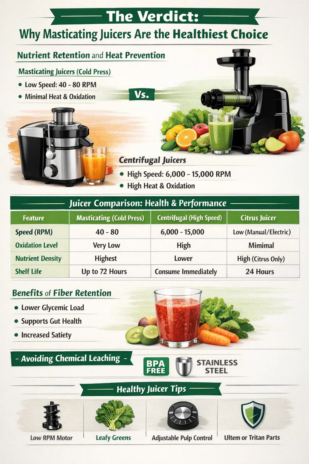 เมื่อให้ความสำคัญกับสุขภาพและความหนาแน่นของสารอาหาร เครื่องคั้นน้ำผลไม้บดเคี้ยว (หรือเรียกอีกอย่างว่าเครื่องคั้นน้ำผลไม้แบบสกัดเย็น) เป็นเครื่องคั้นน้ำผลไม้ที่ดีต่อสุขภาพที่สุด ใช้ได้ ต่างจากรุ่นความเร็วสูง เครื่องคั้นน้ำแบบบดใช้สกรูหรือสว่านหมุนช้าเพื่อบดผักและผลไม้ ซึ่ง ลดการเสียดสีความร้อนและการเกิดออกซิเดชัน . กระบวนการที่อ่อนโยนนี้ช่วยให้มั่นใจได้ว่าวิตามิน แร่ธาตุ และเอนไซม์ที่มีชีวิตอันละเอียดอ่อนยังคงสภาพเดิม จึงเป็นเครื่องดื่มที่มีคุณค่าทางโภชนาการมากขึ้น ซึ่งสามารถคงความสดได้นานถึง 72 ชั่วโมง