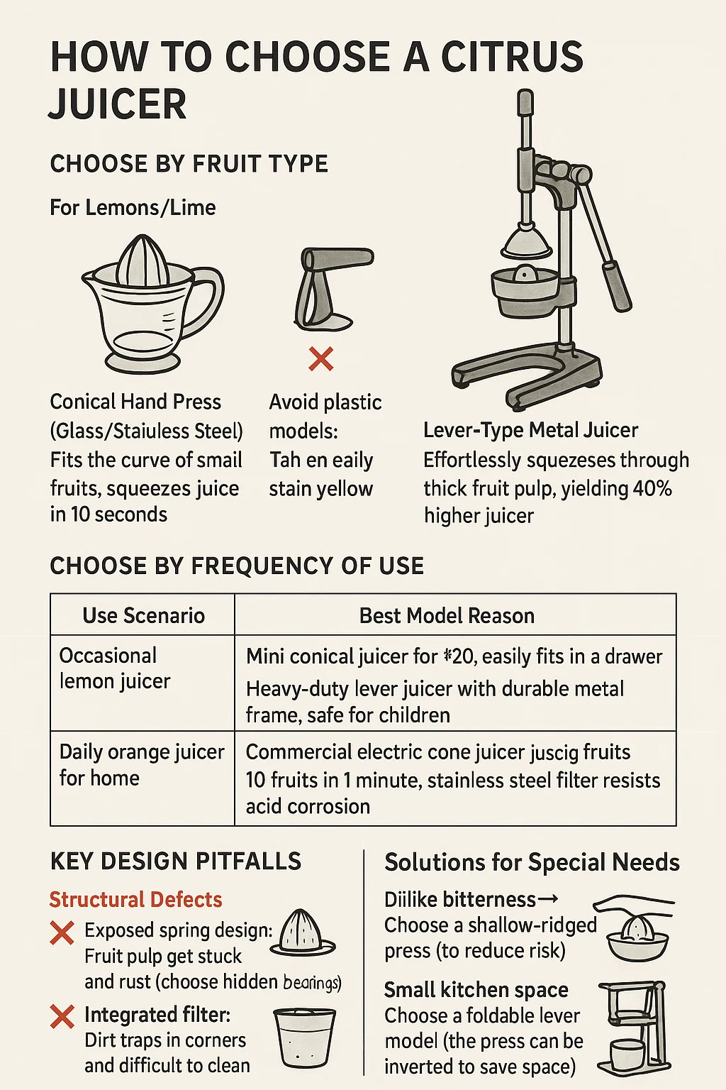 | ใช้เป็นครั้งคราว (เช่น 1-2 มะนาว/มะนาวต่อสัปดาห์) | เครื่องกดกรวยมือถือขนาดเล็ก | • ค่าใช้จ่ายต่ำกว่า $5• พอดีกับลิ้นชักในห้องครัว• ทำความสะอาดได้ทันที |